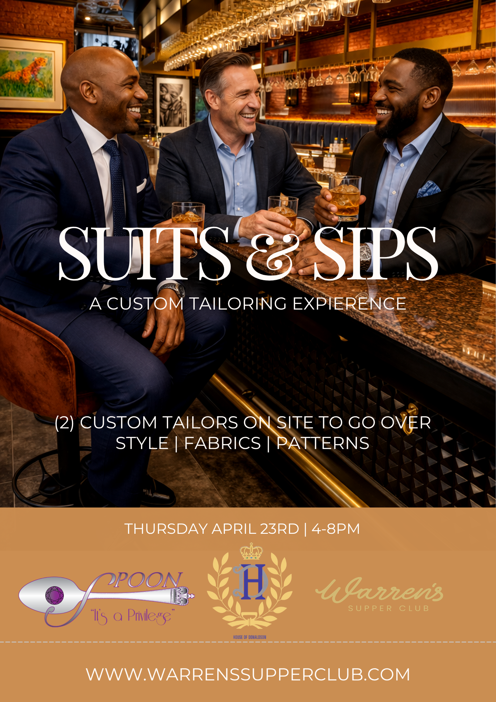 Join us Thursday, April 23rd for our inaugural Suits & Sips—an elevated experience where style meets sophistication. We’ll have two custom tailors on-site to help you explore fabrics, patterns, and designs to create the perfect custom suit tailored just for you.